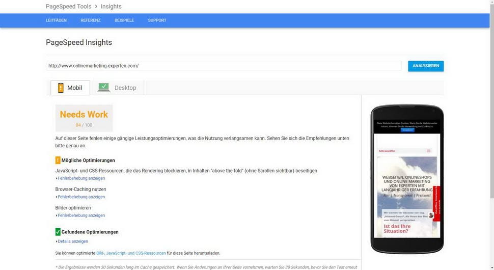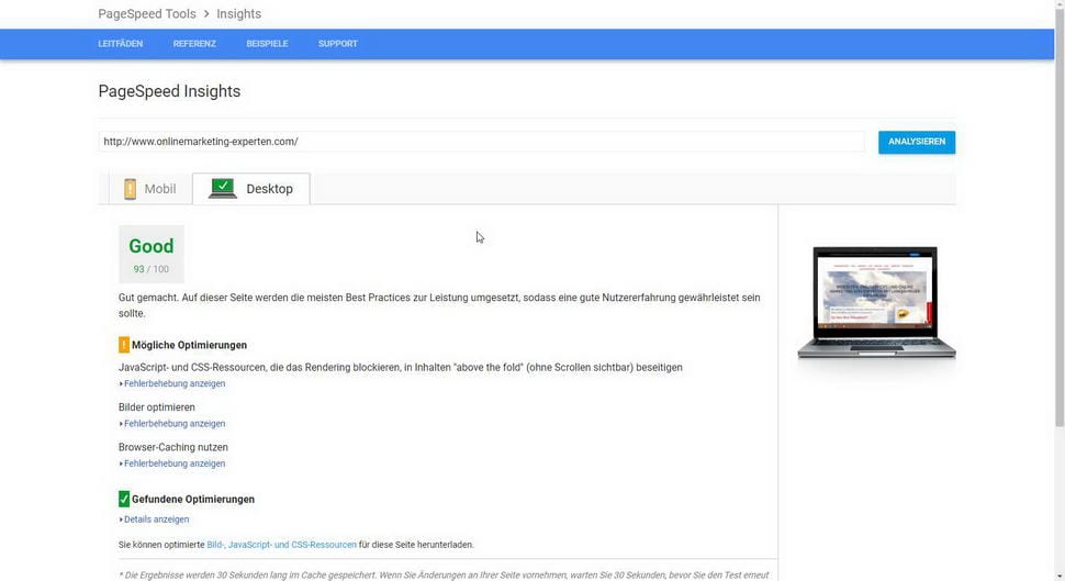 - Google Pagespeed nach der Optimierung: Mobile 84 / Desktop 93