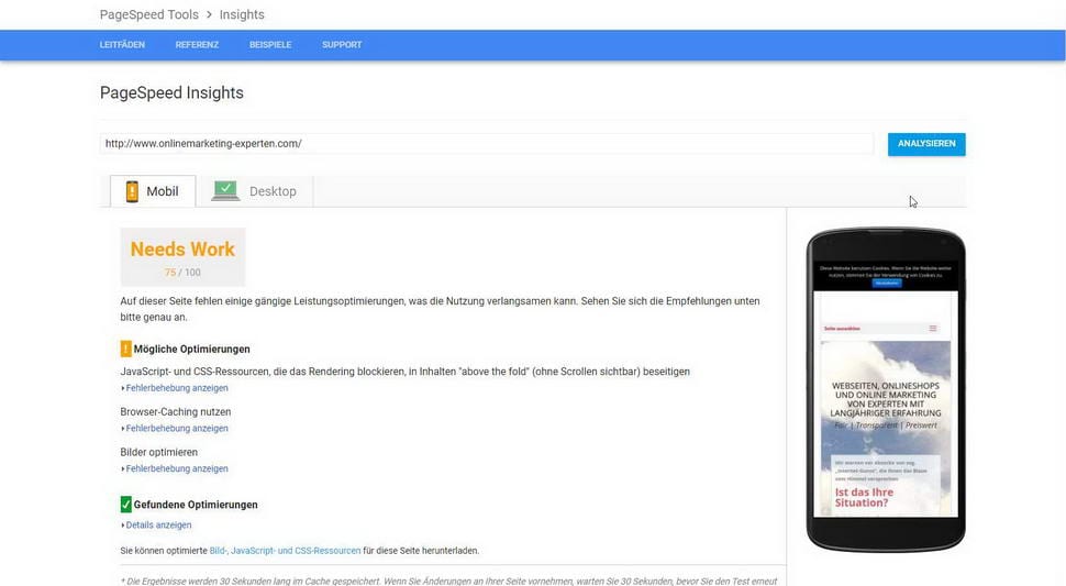 - Google Pagespeed vor der Optimierung: Mobile 75 / Desktop 90